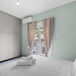 Upstairs, you’ll find a bright and modernly decorated bedroom with a double bed, a spacious wardrobe, a private balcony, and air conditioning. Next to the bedroom, there’s a second bathroom with a shower, sink, and toilet.